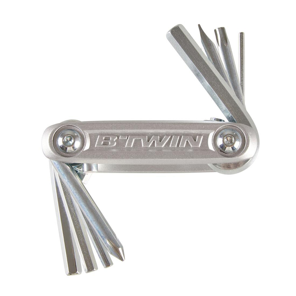 5 clés Allen 2/3/4/5/6 mm, 1 cruciforme PH2, 1 clé torx T25, 1 tournevis plat.